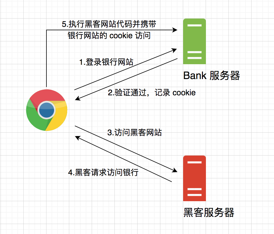 - 银⾏⽹站接收请求后,对 Cookie 进⾏验证通过,误认为是用户⾃⼰发起的请求