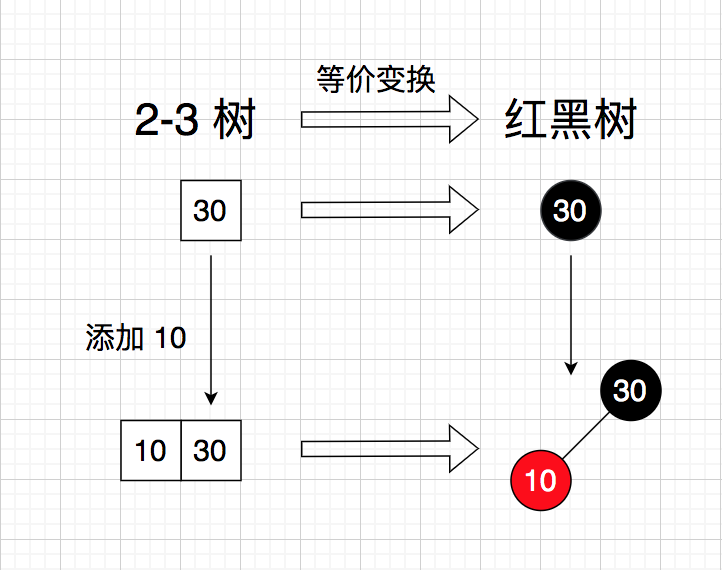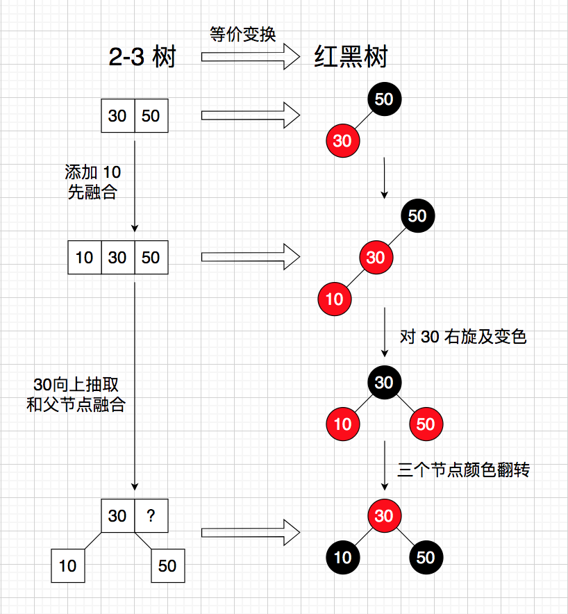 由于 2-3 树的这种结构以及融合、拆分的过程难于⽤代码操作,所以可以通过⼀些规则,将 2-3 树等价变换成红⿊树。